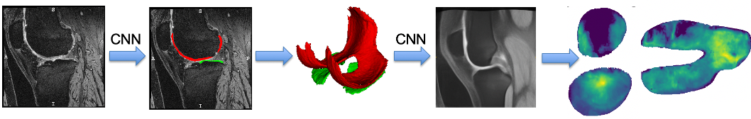 OAI analysis pipeline. From left to right. 1) Input MR image; 2) Automatic segmentation result as obtained from our convolutional neural network; 3) Extracted cartilage in 3D based on which the cartilage thickness is computed; 4) Registration of the input image to atlas space using our fast deep-learning based registration algorithm (this registration then also brings the cartilage segmentation and its associated thickness values to atlas space); 5) Now that everything is in atlas space it is represented in the plane for easy statistical analysis (via unrolling based on a cylinder for the femoral cartilage and projection onto the best-fitting plane for the tibial cartilage). Statistical analyses start from the images on the right.